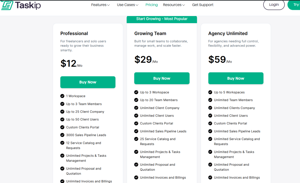 | Taskip | Solopreneur, freelancers, small to large agencies | ✅ | Moderate | ✅ | $12/m |