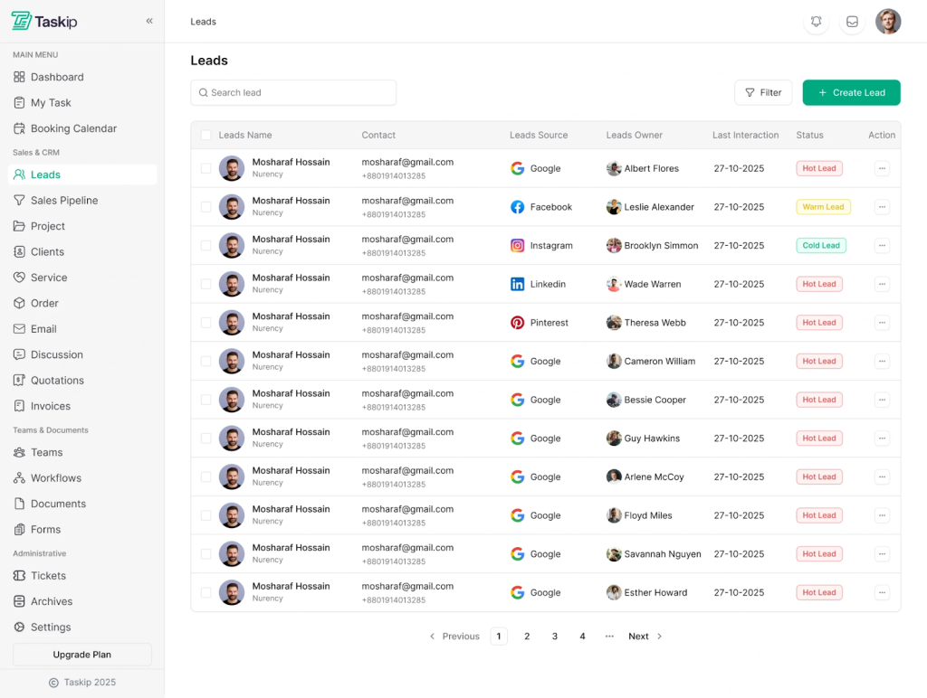 Taskip tracks leads from Google, Facebook, LinkedIn, Instagram, referrals, and more. Thus, you can track which channel brings the most leads and design your marketing strategy accordingly.