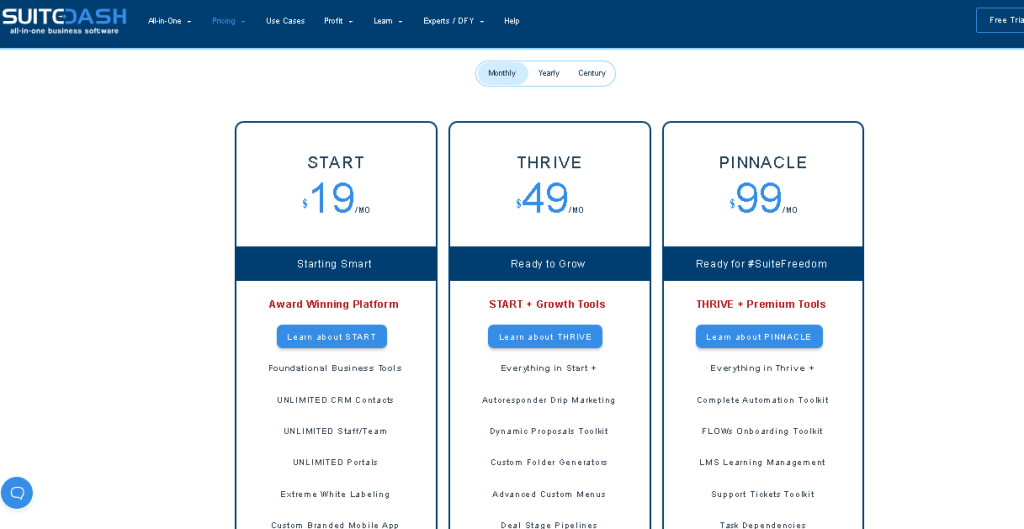SuiteDash offers three plans on a monthly, yearly, or century basis.
