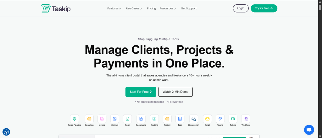 Taskip is purpose-built for agencies seeking an integrated solution without the complexity of traditional CRMs. Unlike fragmented tool stacks, Taskip consolidates 8+ essential business tools into one seamless platform.