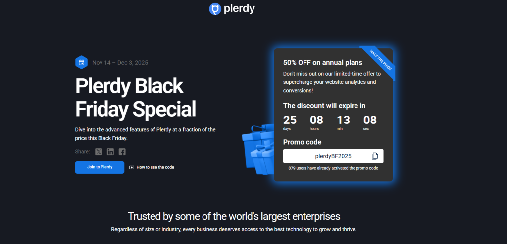 | SEO. CRO & Content Marketing | Plerdy | Website analytics, Heatmaps, SEO Audit, Conversion Funnels & more | 50% OFF on Annual Plans | plerdyBF2025 | Nov 14 – Dec 03, 2025 |