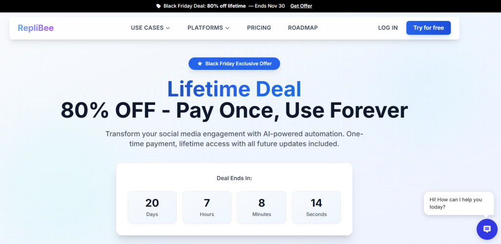 | Social Media Marketing | RepliBee | Automates comments, replies, and posts across Facebook, TikTok, LinkedIn, YouTube & more. | Flat 80% OFF | No Coupon Required | Nov 10, 2025 – Jan 15, 2026 |