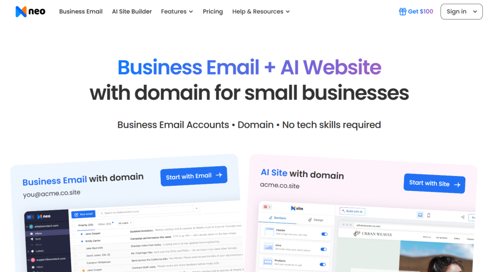 Neo is an all-in-one platform designed for small businesses to launch and grow online with ease. It combines professional business email, a free custom domain, and an AI powered website builder, giving entrepreneurs everything they need to establish a credible online presence in minutes. Rated 4.6★ on both G2 and Trustpilot, Neo is recognised as a High Performer, a Top Trending Product, and the number one “Easiest to Use” Email Software, making it a reliable and user friendly choice for SMBs.