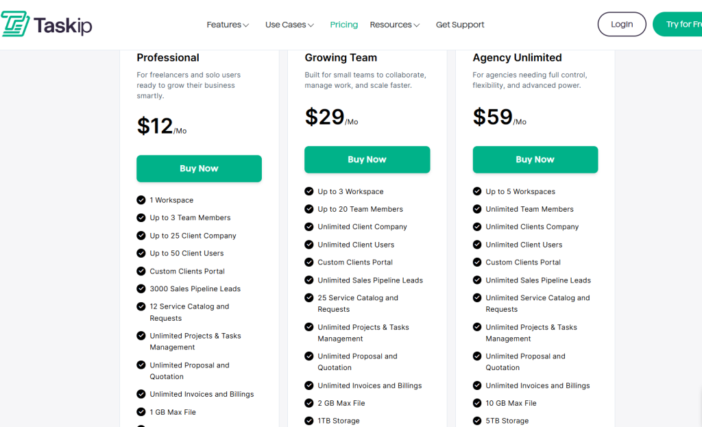 As you can see, the Taskip Professional plans bring you more features, user access, and storage at a low cost. And if you switch to the yearly plan, the cost is reduced to 50%!