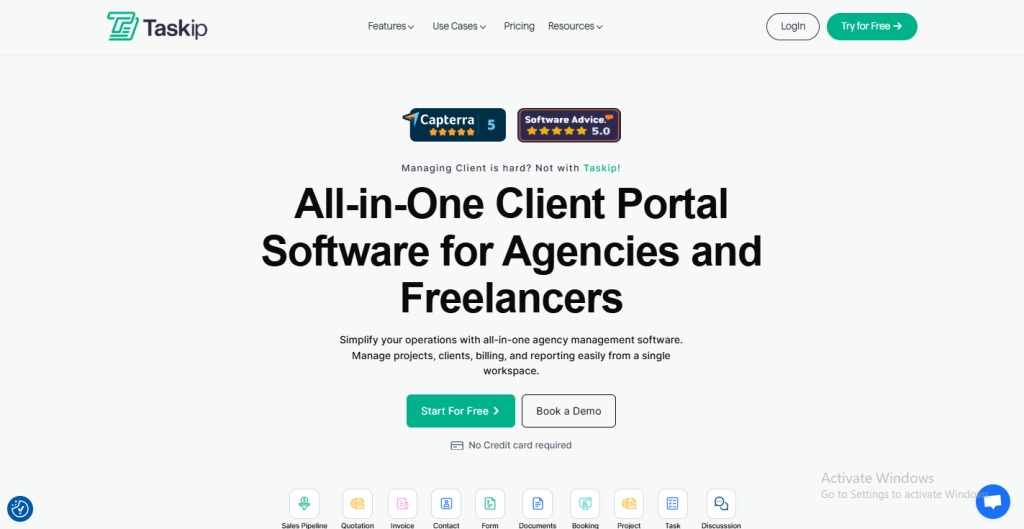 - Taskip – All-in-one platform with CRM, proposals, contracts, invoicing, automation, branded client portals, and project management.