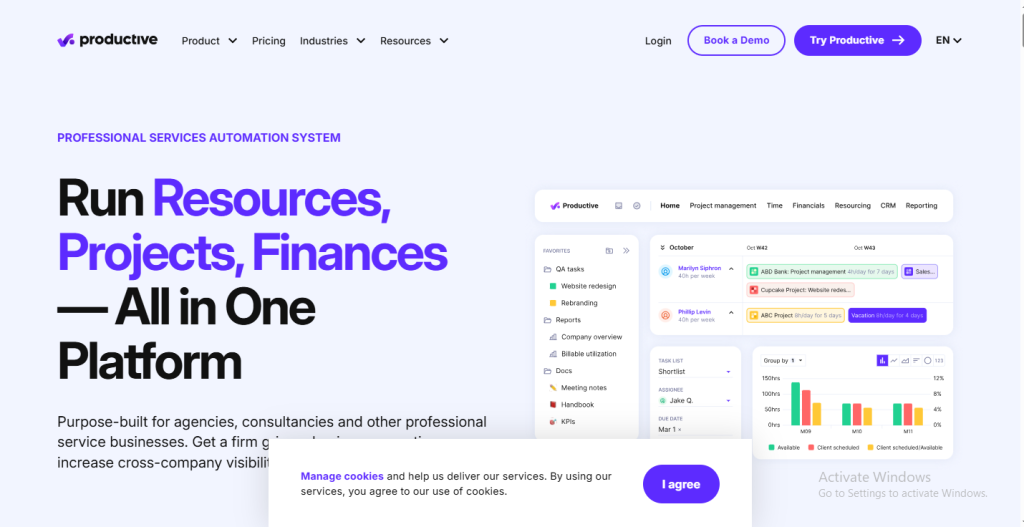 Productive.io is an end-to-end agency management platform designed for small-to-mid-sized agencies that want both project management and financial control in one place. Unlike Clientjoy, which is more CRM and billing-focused, Productive.io puts equal emphasis on project delivery and profitability tracking — making it a favorite among agencies that need visibility into how work affects revenue.