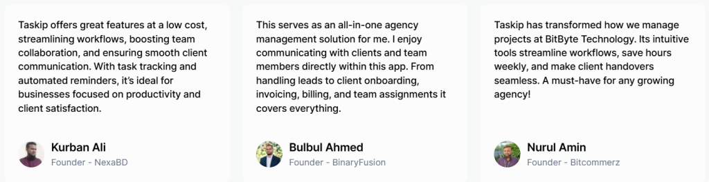 A: No. Even small agencies benefit from professional client portals, automation, and invoicing. Taskip’s pricing scales down to small teams, and the ROI is still strong. At 3 people, a spreadsheet is chaos. At 3+ people, a CRM becomes obvious.