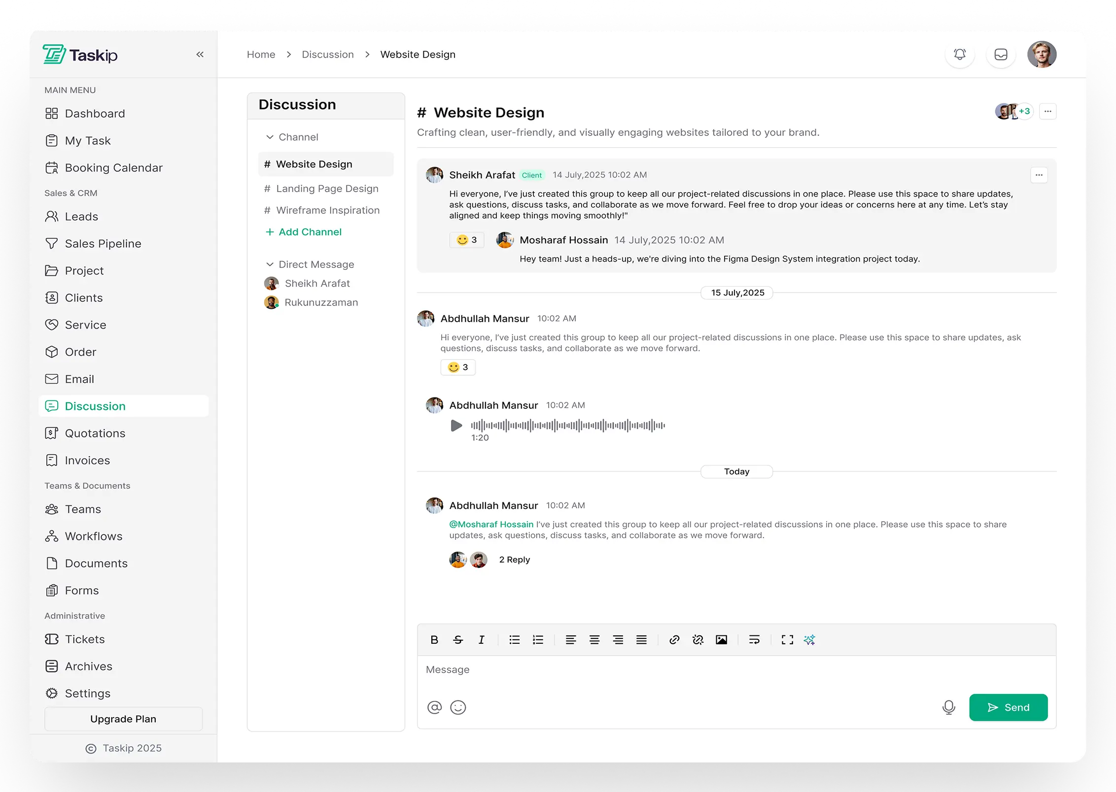 Taskip Discussion is a communication hub for teams and clients. You can create channels, send messages, share links, and collaborate using AI powered assistance, all in one organized place.