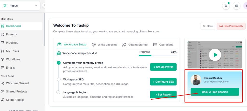 - Navigate to the Dashboard and click Book a Free Session.
