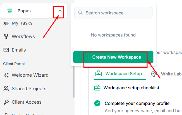 - From the top-left corner of the dashboard, click the workspace switcher (arrow icon) next to the current workspace name.