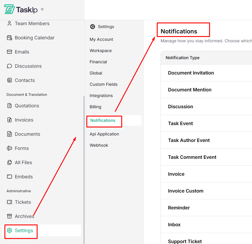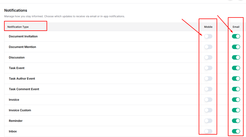 | Tips * Enable email notifications for critical updates such as invoice payments and system errors. * Use mobile notifications for time-sensitive actions like task assignments and meeting bookings. * Fine-tuning notifications helps maintain focus while staying informed. |