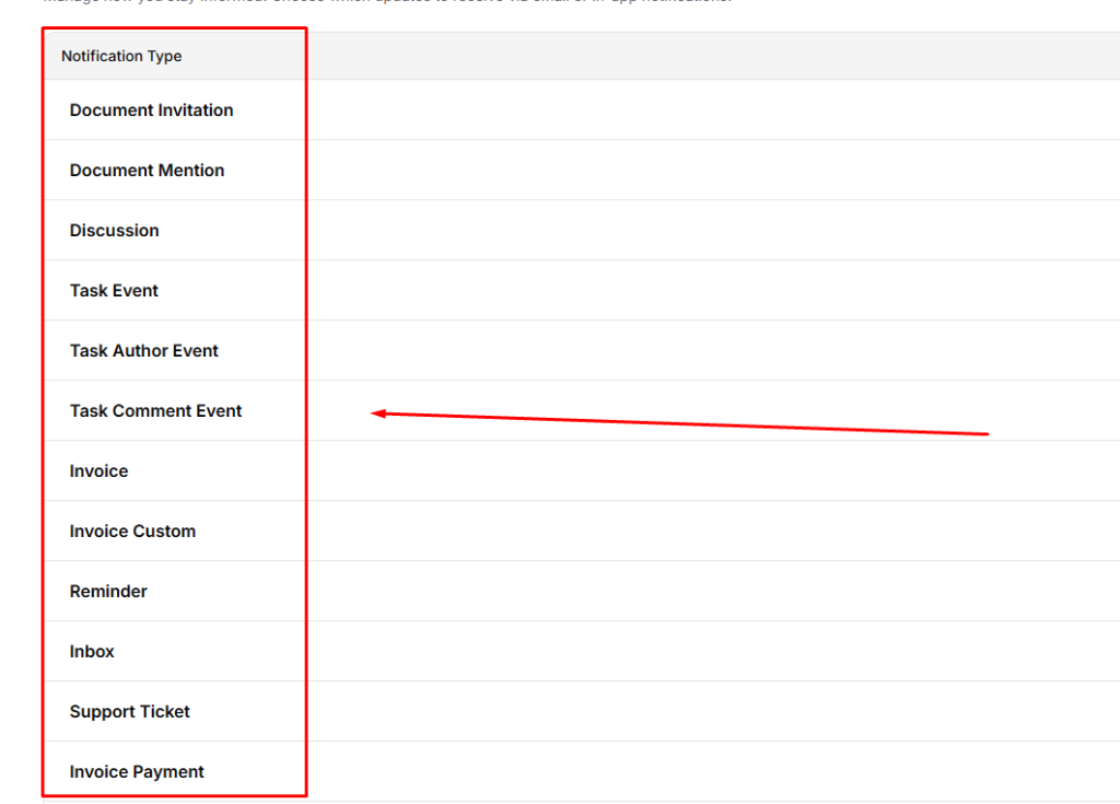| Projects | Task Assign, Task Complete, Priority Change, Manager Assign, Discussion Message, Task Comment |