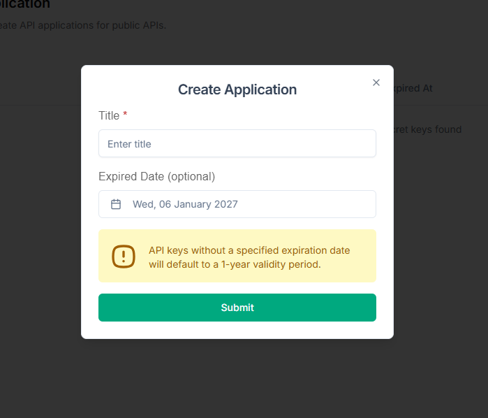 Each application generates a unique API key that authorizes access to Taskip’s public APIs.