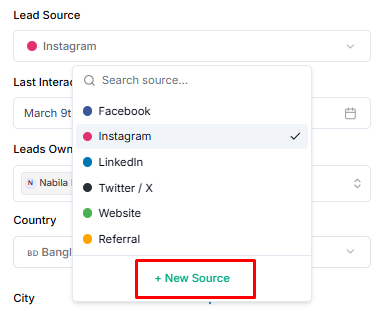 Your new source will now appear in the Lead Source dropdown when creating or editing leads.