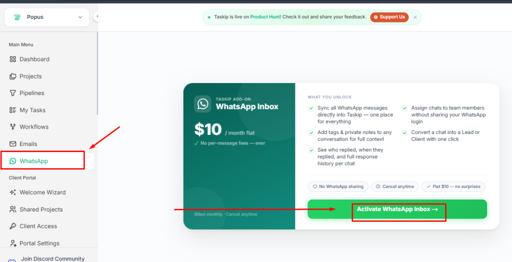 Taskip has built-in WhatsApp integration, so you can add it directly from your dashboard. Here are the steps to follow: