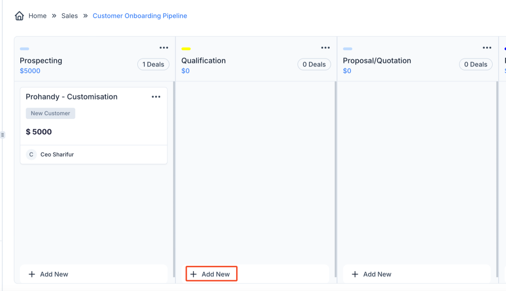 - In the sales pipeline, choose the appropriate stage where you want to add the new deal. For example, you might place a new deal in the Prospecting stage.