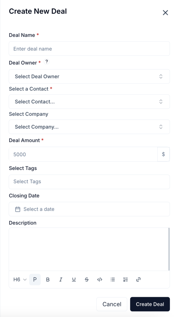 - After filling in all the necessary details, click the Create Deal button to save the deal in the pipeline.
