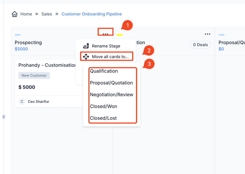 - In the Sales Pipeline, locate the stage from which you want to move all the deals. For example, you may want to move deals from the Prospecting stage.