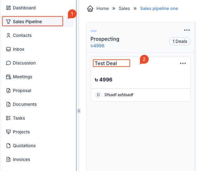 - Go to the Sales Pipeline and click on the specific deal where you want to add a meeting. This will open the deal’s detailed view.