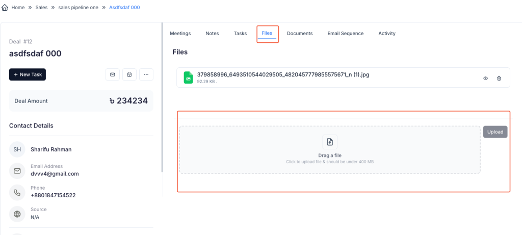 Follow these steps to upload and attach files to a deal in Taskip’s Sales Pipeline: