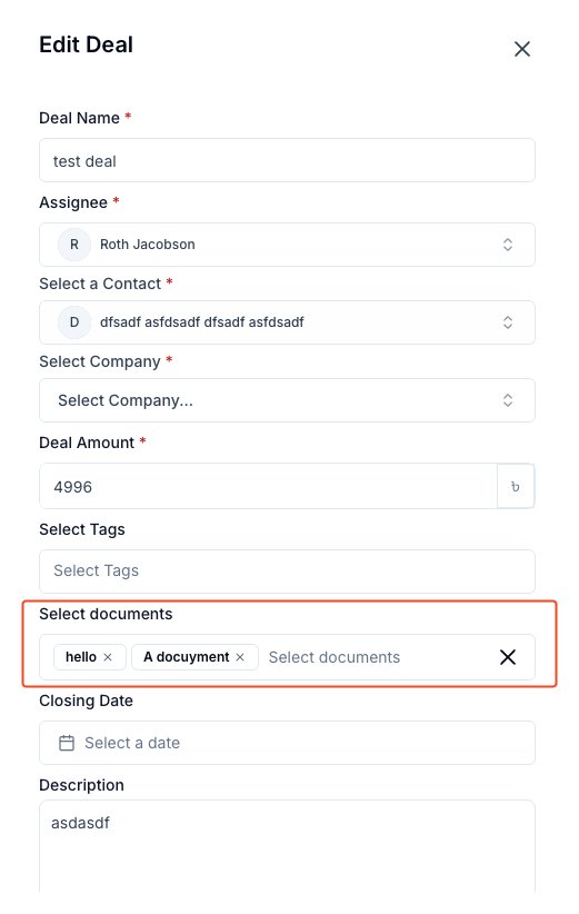 - Scroll down to the Select Documents field in the Edit Deal modal.
