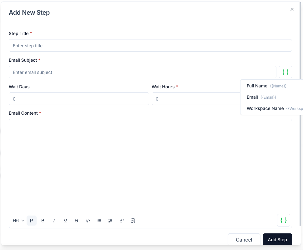 - Wait Days / Wait Hours – Specify the delay before sending this email after the previous step.