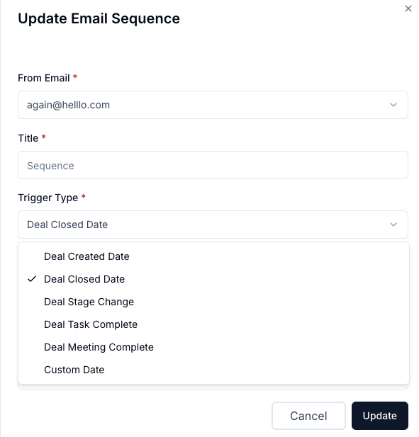 - Deal Closed Date – Starts the sequence after the deal is closed.