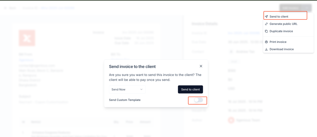- Toggle the switch next to Send Custom Template to activate the template selection field
