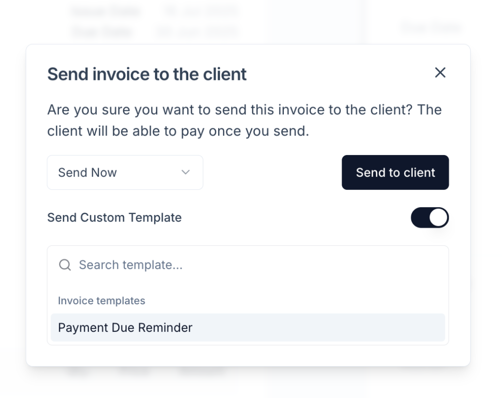 In Taskip, you can send invoices using custom-designed email templates to maintain brand consistency and professionalism. This feature allows you to personalize the communication your client receives with dynamic placeholders and reusable layouts.