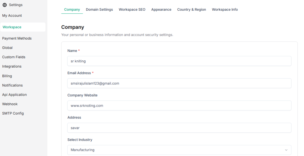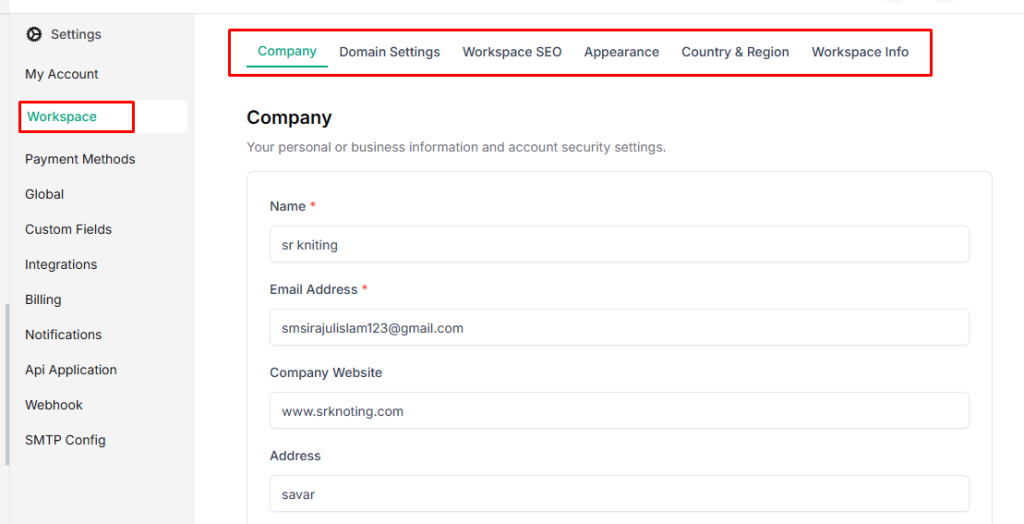 - Go to Settings → Workspace → Company.