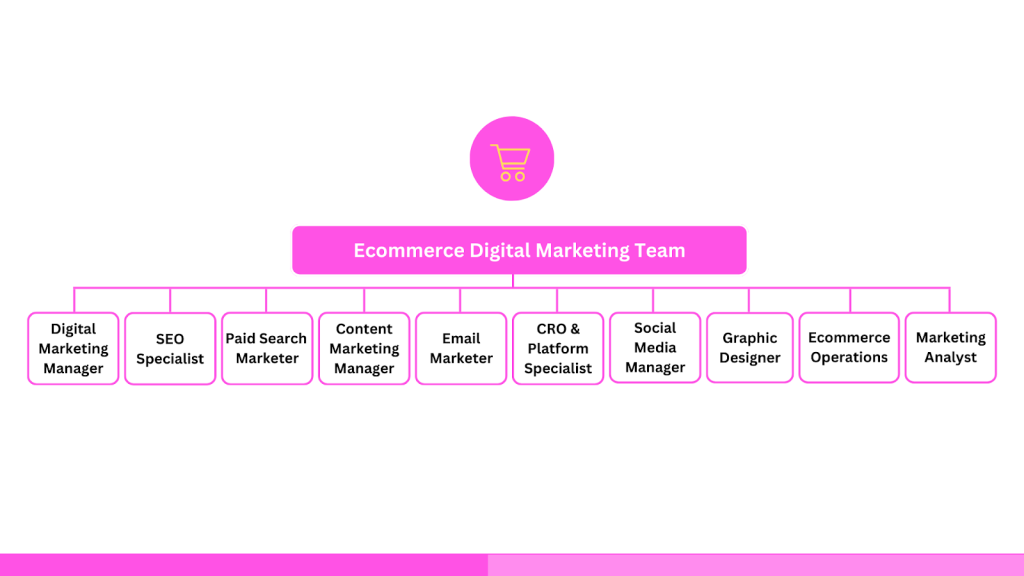 E-commerce marketing teams live and breathe numbers. Their goal is performance, so their structure leans heavily on PPC (pay-per-click) experts, conversion rate optimization (CRO) specialists, and analytics-driven campaign managers. Every team member contributes to one main objective: turning clicks into sales. Real-time testing and data-driven decision-making guide their daily work.
