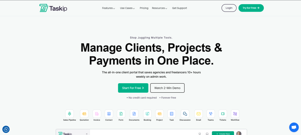 A solid CRM keeps client relationships front and center, tracking leads from pitch to retainer. HubSpot stands out with its free tier for contact management and email tracking, integrating seamlessly with marketing automation. For agencies craving an all-in-one solution, Taskip.net shines by combining CRM with a dedicated client portal—clients log in to view project updates, invoices, and files in one spot, cutting down on endless email threads. Taskip’s sales pipeline lets teams nurture deals effortlessly, while features like custom proposals and automated invoicing handle billing without the hassle, making it a game-changer for scaling operations affordably starting at $59 per user monthly.