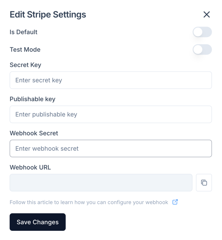 Step 1: Access Payment Settings Navigate to your Taskip dashboard and go to Settings → Payment Gateways → Stripe.