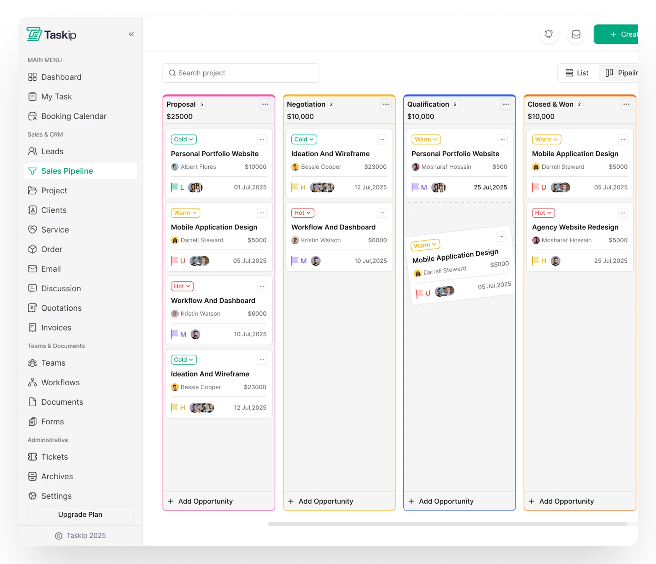 Build from scratch or use prebuilt templates. Define your own stages, such as Qualification, Proposal, Negotiation, or Closed Won, whatever fits your workflow.