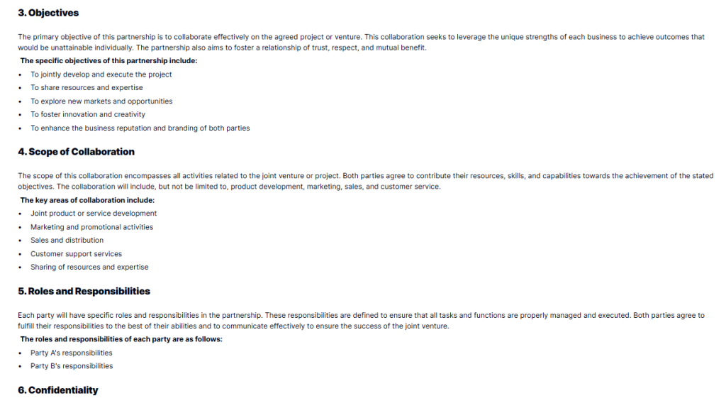 - Roles & Responsibilities: Identifies who is responsible for what in the partnership.