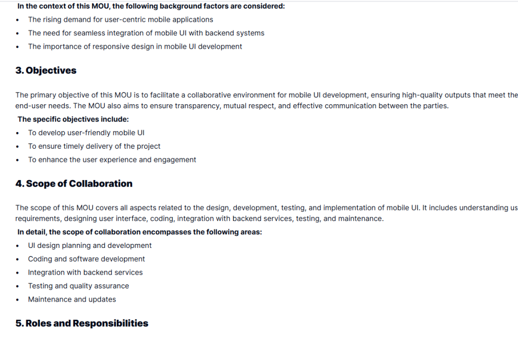 • Terms and Duration: Defines how long the MOU and project engagement will last.
