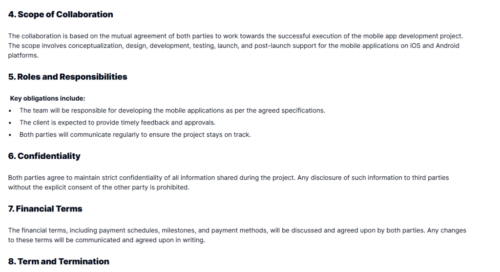 - Confidentiality Clauses: Protects sensitive strategies and proprietary information shared during collaboration.