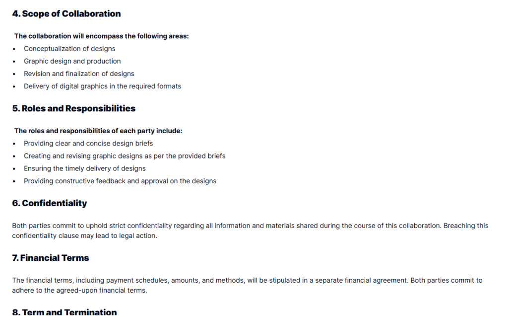• Confidentiality Clauses: Defines how confidential material, such as brand assets or design files—must be handled.